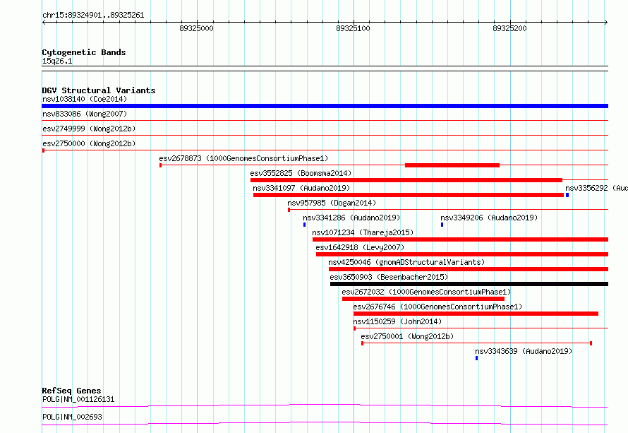 | | Variant Type | CNV deletion | | Copy Number | | | Allele State | | | Allele Origin | | | Probe Count | | | Validation Flag | | | Merged Status | S | | Merged Variants | esv2750000, esv2749999 | | Supporting Variants | | | Samples | SSM081 | | Known Genes | POLG | | Method | Sequencing | | Analysis | Breakdancer:4 times standard deviation,VariationHunter:4 times standard deviation and at least 3 supportting reads | | Platform | Illumina HiSeq 2000 | | Comments | | | Reference | Wong_et_al_2012b | | Pubmed ID | 23290073 | | Accession Number(s) | essv6831741