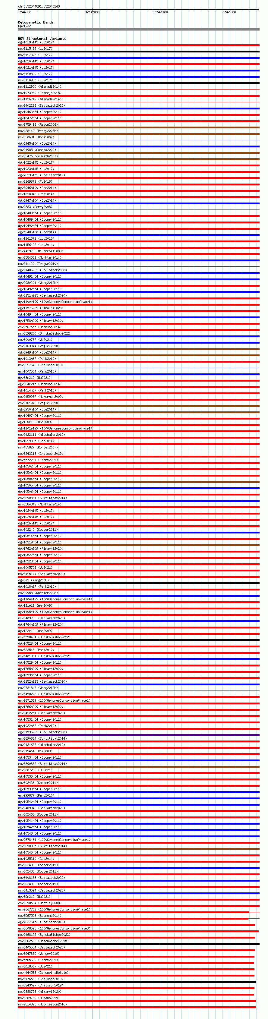 Variant DetailsVariant: essv6833737| Internal ID | 10233658 | | Landmark | | | Location Information | | | Cytoband | 6p21.32 | | Allele length | | Assembly | Allele length | | hg38 | 353 | | hg19 | 353 |