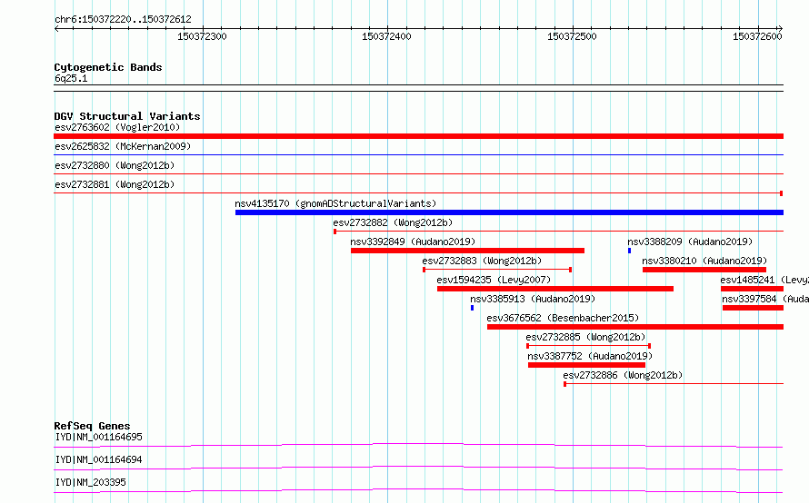 Variant DetailsVariant: essv6833877Internal ID | 9887098 | Landmark | | Location Information | | Cytoband | 6q25.1 | Allele length | Assembly | Allele length | hg38 | 393 | hg19 | 393 |