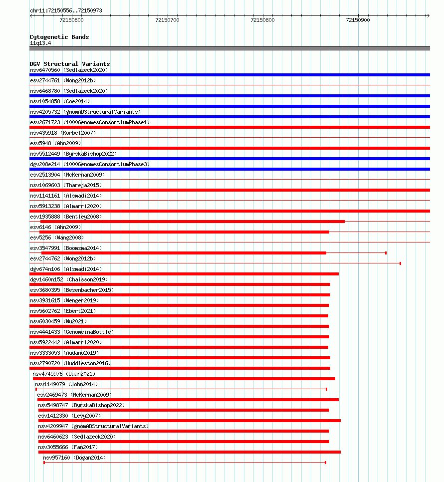 Variant DetailsVariant: essv6834098| Internal ID | 10006278 | | Landmark | | | Location Information | | | Cytoband | 11q13.4 | | Allele length | | Assembly | Allele length | | hg38 | 418 | | hg19 | 418 |