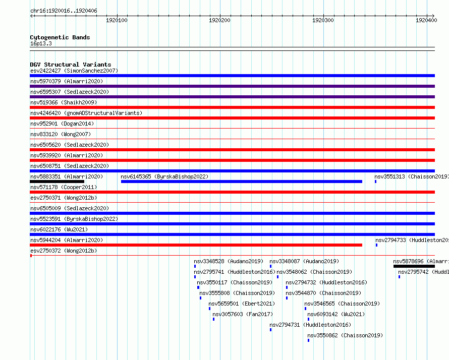 Variant DetailsVariant: essv6835315| Internal ID | 10235078 | | Landmark | | | Location Information | | | Cytoband | 16p13.3 | | Allele length | | Assembly | Allele length | | hg38 | 391 | | hg19 | 391 |