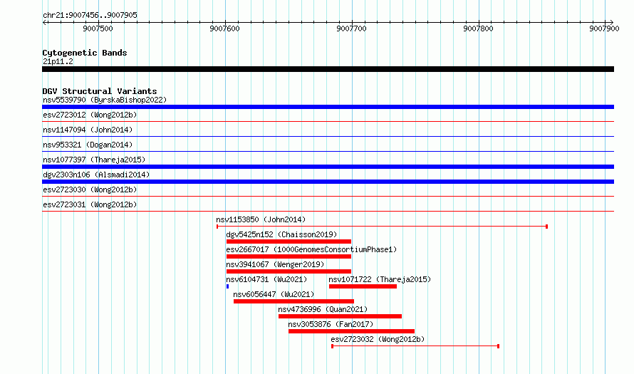 Variant DetailsVariant: essv6836027| Internal ID | 10235720 | | Landmark | | | Location Information | | | Cytoband | 21p11.2 | | Allele length | | Assembly | Allele length | | hg38 | 450 | | hg19 | 450 |