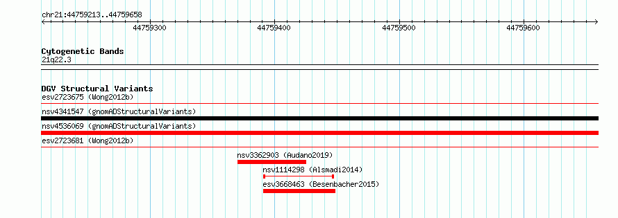 Variant DetailsVariant: essv6836097| Internal ID | 9889097 | | Landmark | | | Location Information | | | Cytoband | 21q22.3 | | Allele length | | Assembly | Allele length | | hg38 | 446 | | hg19 | 446 |
