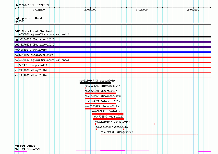 Variant DetailsVariant: essv6836478| Internal ID | 10236499 | | Landmark | | | Location Information | | | Cytoband | 2p22.2 | | Allele length | | Assembly | Allele length | | hg38 | 381 | | hg19 | 381 |