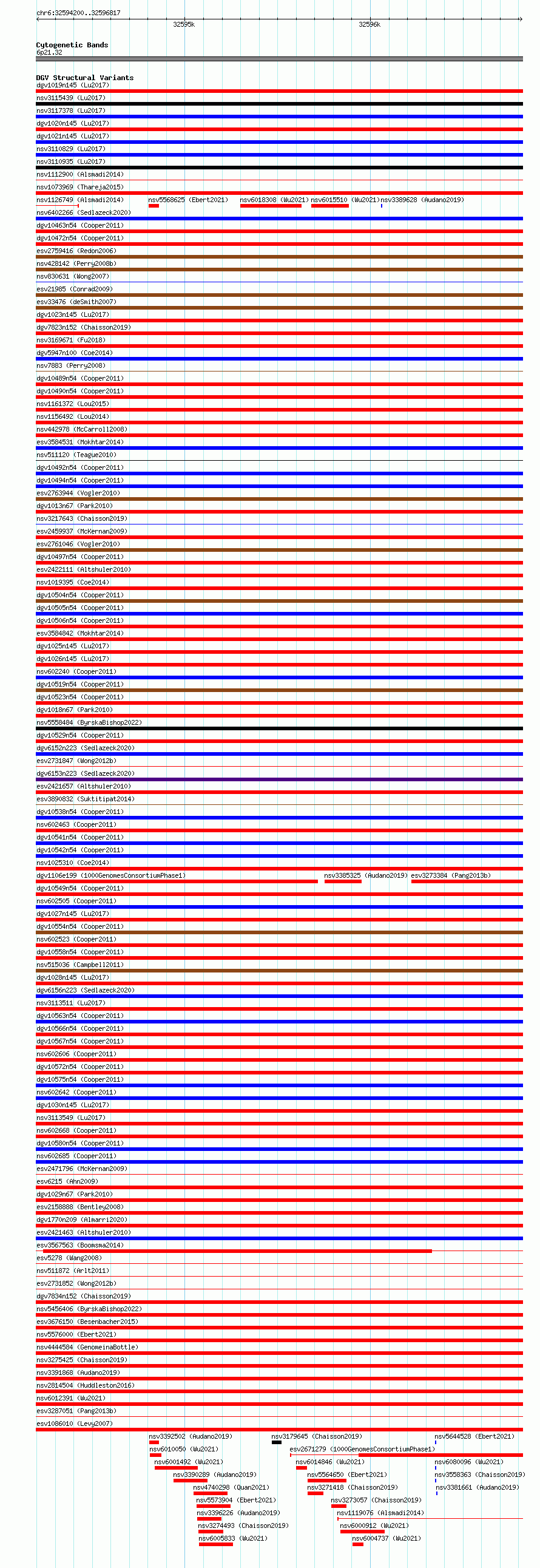 Variant DetailsVariant: essv6837424| Internal ID | 10237351 | | Landmark | | | Location Information | | | Cytoband | 6p21.32 | | Allele length | | Assembly | Allele length | | hg38 | 2618 | | hg19 | 2618 |