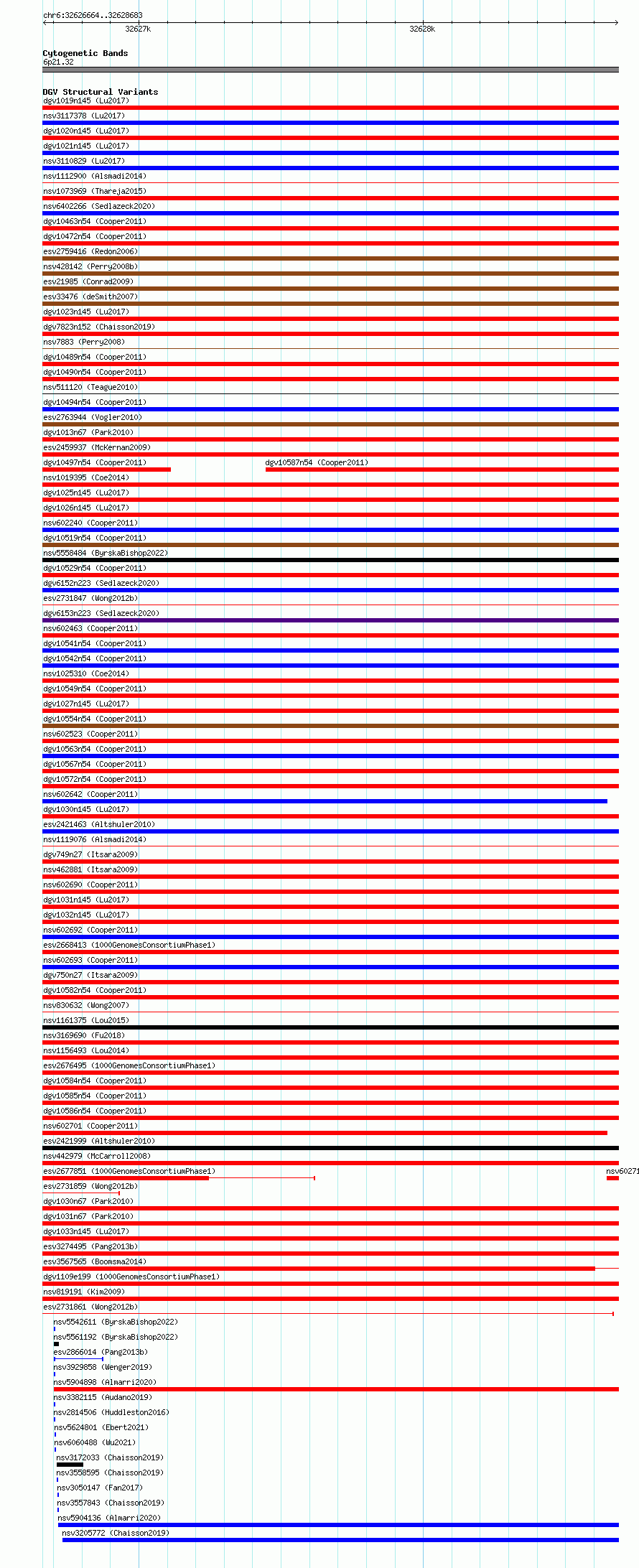Variant DetailsVariant: essv6837426| Internal ID | 10237353 | | Landmark | | | Location Information | | | Cytoband | 6p21.32 | | Allele length | | Assembly | Allele length | | hg38 | 2020 | | hg19 | 2020 |