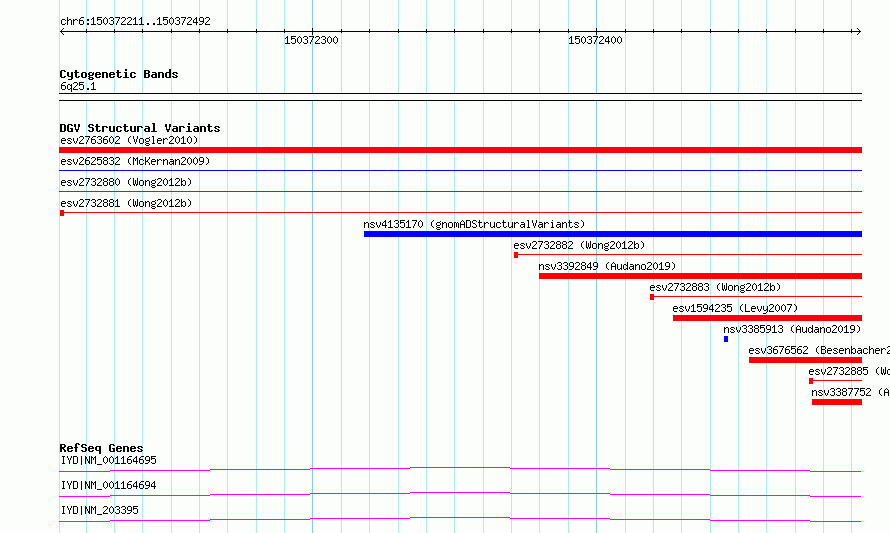 | Variant Type | CNV deletion | Copy Number | | Allele State | | Allele Origin | | Probe Count | | Validation Flag | | Merged Status | S | Merged Variants | esv2732881, esv2732880 | Supporting Variants | | Samples | SSM083 | Known Genes | IYD | Method | Sequencing | Analysis | Breakdancer:4 times standard deviation,VariationHunter:4 times standard deviation and at least 3 supportting reads | Platform | Illumina HiSeq 2000 | Comments | | Reference | Wong_et_al_2012b | Pubmed ID | 23290073 | Accession Number(s) | essv6837541