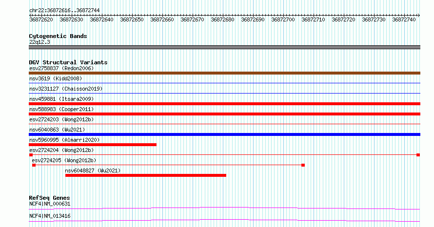 Variant DetailsVariant: essv6839784| Internal ID | 10236062 | | Landmark | | | Location Information | | | Cytoband | 22q12.3 | | Allele length | | Assembly | Allele length | | hg38 | 129 | | hg19 | 129 |