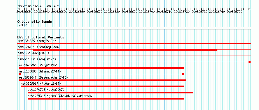 Variant DetailsVariant: essv6840402| Internal ID | 9893158 | | Landmark | | | Location Information | | | Cytoband | 2q33.1 | | Allele length | | Assembly | Allele length | | hg38 | 133 | | hg19 | 133 |