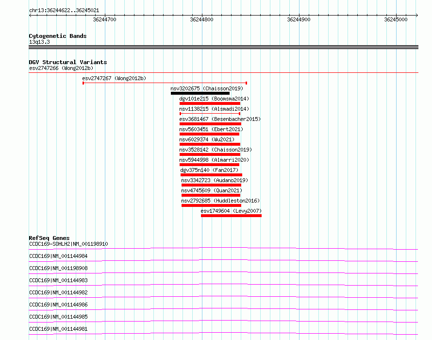Variant DetailsVariant: essv6842577| Internal ID | 10241801 | | Landmark | | | Location Information | | | Cytoband | 13q13.3 | | Allele length | | Assembly | Allele length | | hg38 | 400 | | hg19 | 400 |