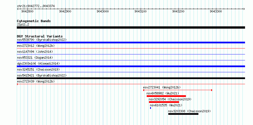 Variant DetailsVariant: essv6843008| Internal ID | 10007984 | | Landmark | | | Location Information | | | Cytoband | 21p11.2 | | Allele length | | Assembly | Allele length | | hg38 | 603 | | hg19 | 603 |