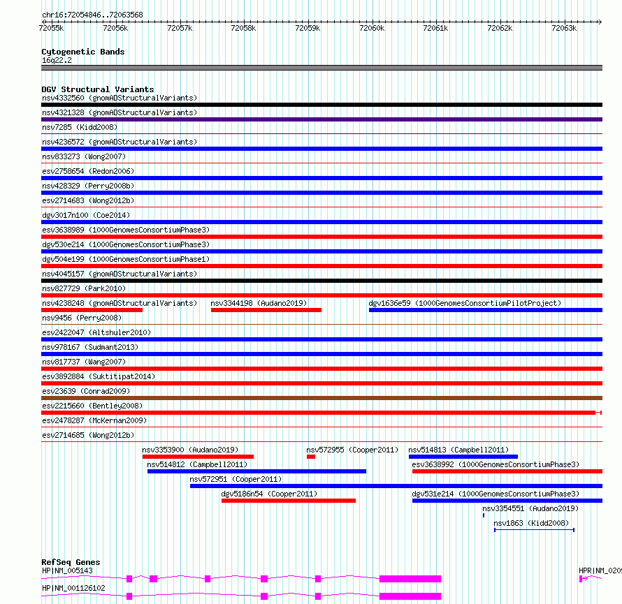 | Variant Type | CNV deletion | Copy Number | | Allele State | | Allele Origin | | Probe Count | | Validation Flag | | Merged Status | S | Merged Variants | esv2714685, esv2714683 | Supporting Variants | | Samples | SSM084 | Known Genes | HP, HPR | Method | Sequencing | Analysis | Breakdancer:4 times standard deviation,VariationHunter:4 times standard deviation and at least 3 supportting reads | Platform | Illumina HiSeq 2000 | Comments | | Reference | Wong_et_al_2012b | Pubmed ID | 23290073 | Accession Number(s) | essv6843047