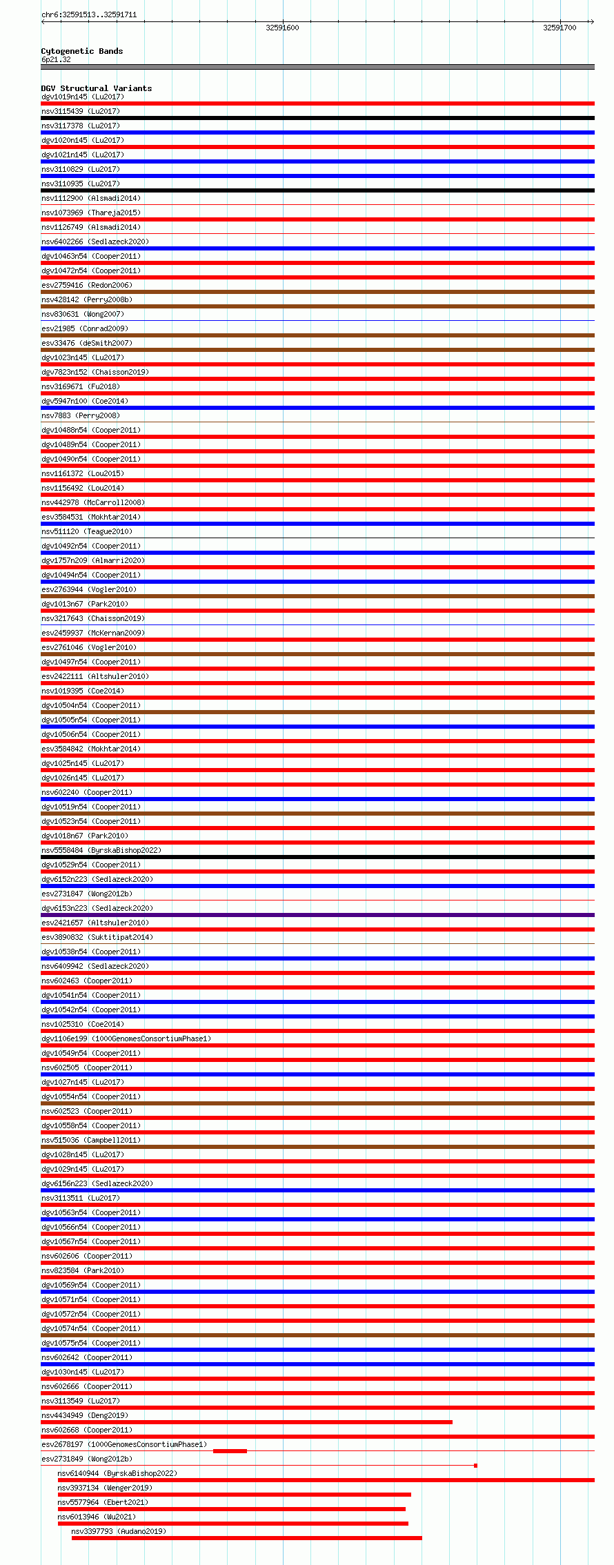 Variant DetailsVariant: essv6844913| Internal ID | 10243904 | | Landmark | | | Location Information | | | Cytoband | 6p21.32 | | Allele length | | Assembly | Allele length | | hg38 | 199 | | hg19 | 199 |