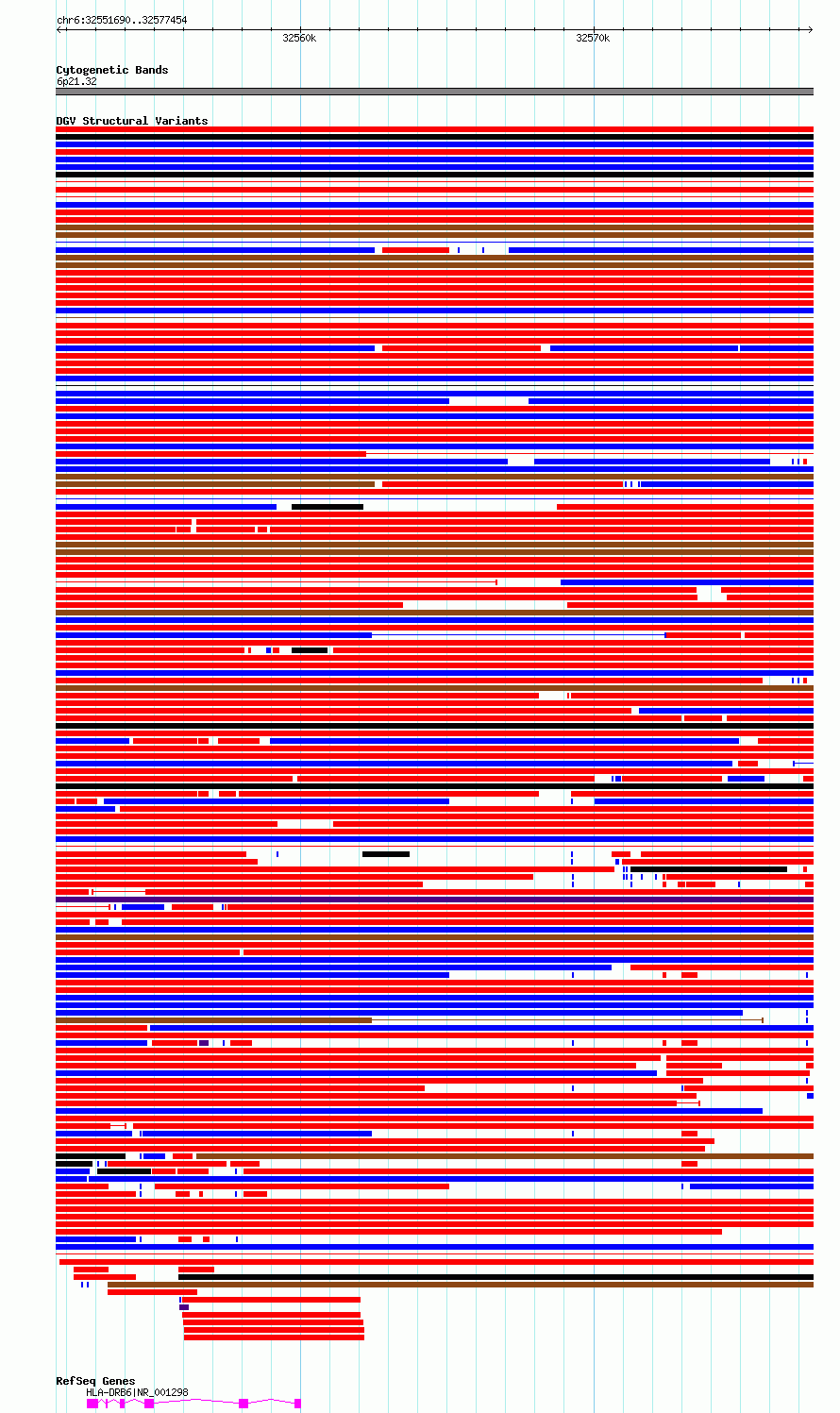 Variant DetailsVariant: essv6844923| Internal ID | 10243913 | | Landmark | | | Location Information | | | Cytoband | 6p21.32 | | Allele length | | Assembly | Allele length | | hg38 | 25765 | | hg19 | 25765 |