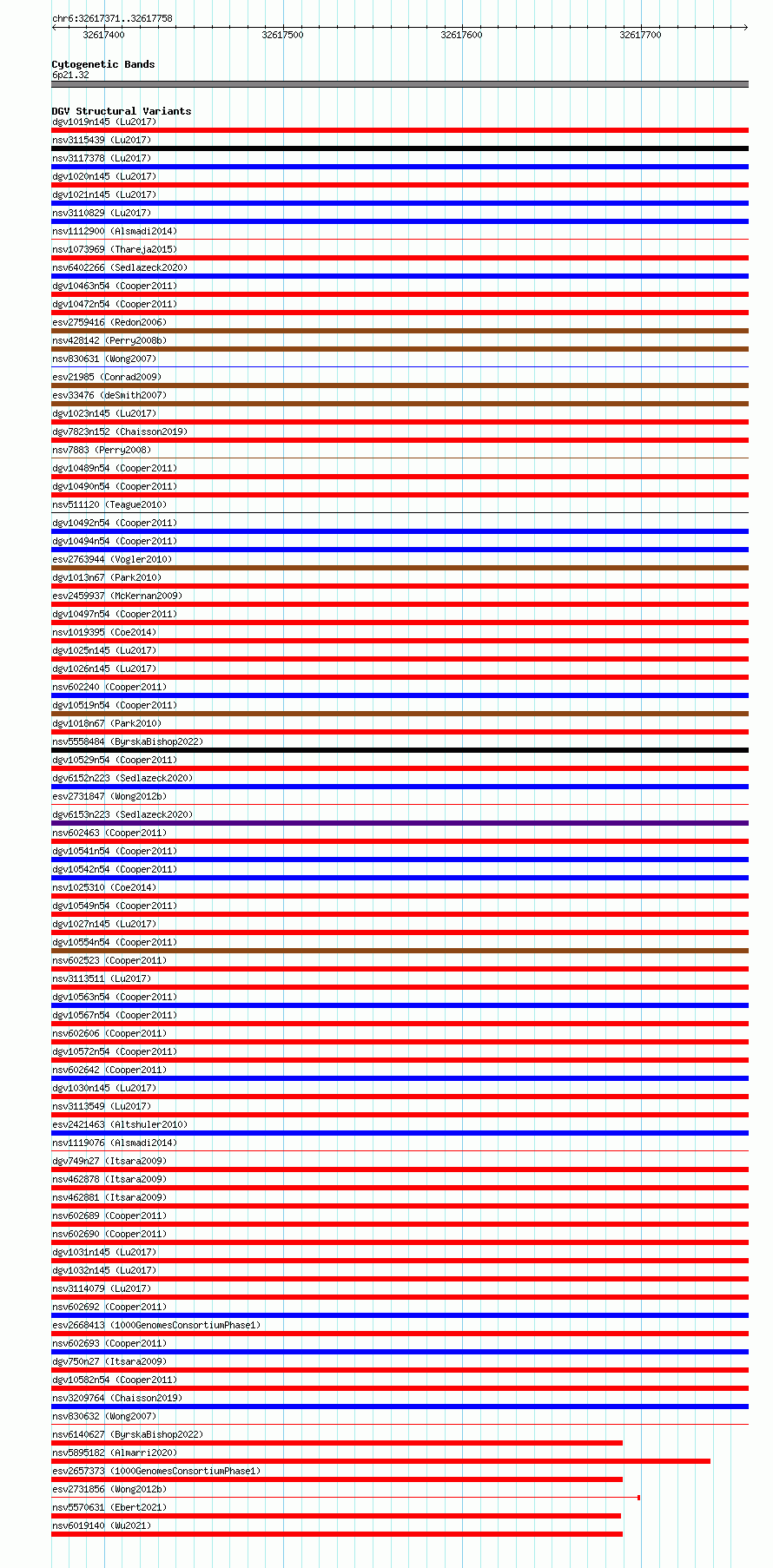 Variant DetailsVariant: essv6844942| Internal ID | 10243930 | | Landmark | | | Location Information | | | Cytoband | 6p21.32 | | Allele length | | Assembly | Allele length | | hg38 | 388 | | hg19 | 388 |