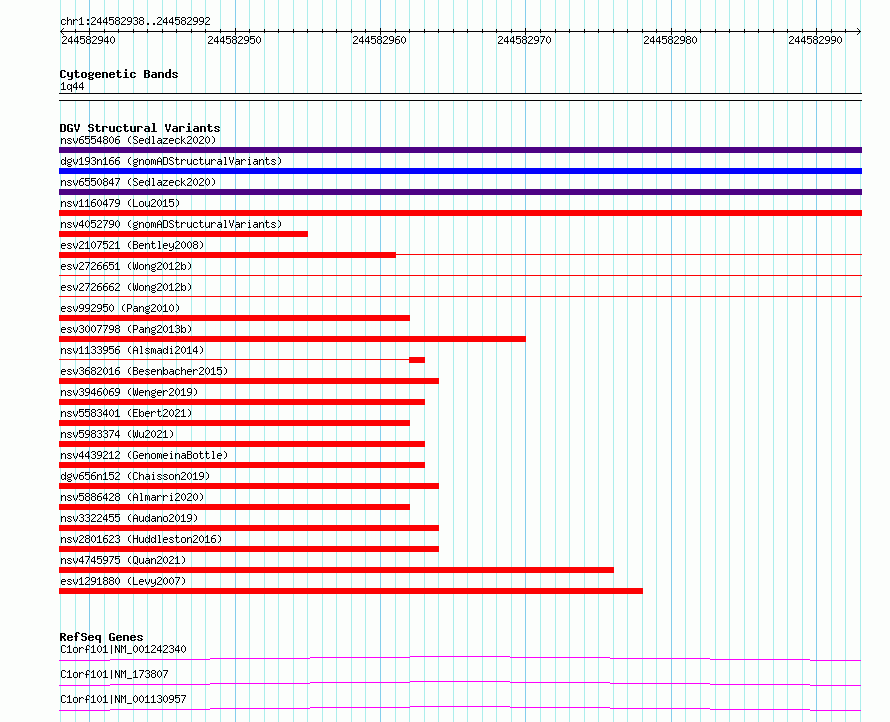 Variant DetailsVariant: essv6847346| Internal ID | 10246094 | | Landmark | | | Location Information | | | Cytoband | 1q44 | | Allele length | | Assembly | Allele length | | hg38 | 55 | | hg19 | 55 |