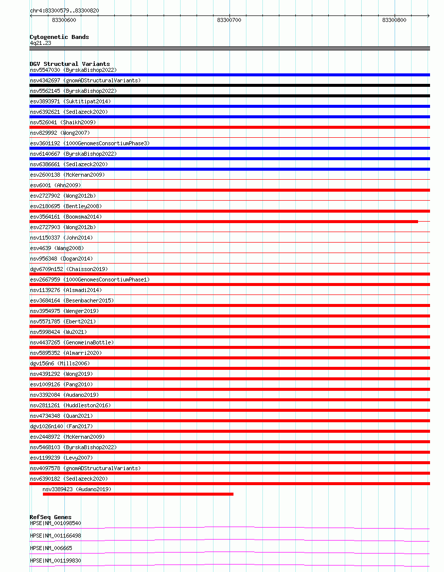| | Variant Type | CNV deletion | | Copy Number | | | Allele State | | | Allele Origin | | | Probe Count | | | Validation Flag | | | Merged Status | S | | Merged Variants | esv2727903, esv2727902 | | Supporting Variants | | | Samples | SSM086 | | Known Genes | HPSE | | Method | Sequencing | | Analysis | Breakdancer:4 times standard deviation,VariationHunter:4 times standard deviation and at least 3 supportting reads | | Platform | Illumina HiSeq 2000 | | Comments | | | Reference | Wong_et_al_2012b | | Pubmed ID | 23290073 | | Accession Number(s) | essv6848368