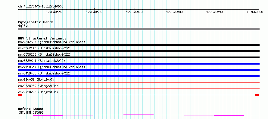 Variant DetailsVariant: essv6848450| Internal ID | 10247087 | | Landmark | | | Location Information | | | Cytoband | 4q28.1 | | Allele length | | Assembly | Allele length | | hg38 | 60 | | hg19 | 60 |
