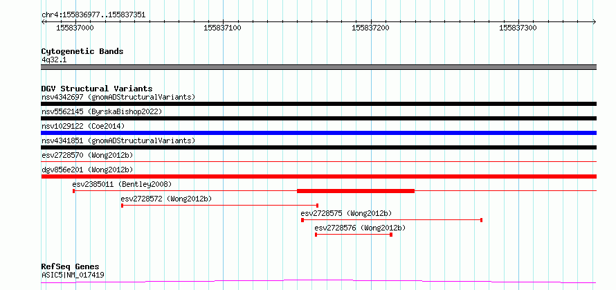 | | Variant Type | CNV deletion | | Copy Number | | | Allele State | | | Allele Origin | | | Probe Count | | | Validation Flag | | | Merged Status | S | | Merged Variants | esv2728570, esv2728571 | | Supporting Variants | | | Samples | SSM086 | | Known Genes | ASIC5 | | Method | Sequencing | | Analysis | Breakdancer:4 times standard deviation,VariationHunter:4 times standard deviation and at least 3 supportting reads | | Platform | Illumina HiSeq 2000 | | Comments | | | Reference | Wong_et_al_2012b | | Pubmed ID | 23290073 | | Accession Number(s) | essv6848512