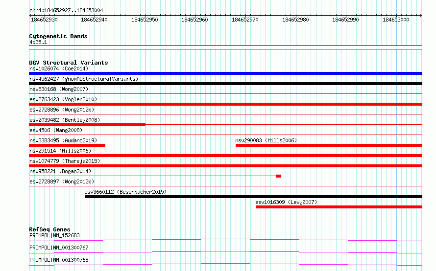 | | Variant Type | CNV deletion | | Copy Number | | | Allele State | | | Allele Origin | | | Probe Count | | | Validation Flag | | | Merged Status | S | | Merged Variants | esv2728896, esv2728897 | | Supporting Variants | | | Samples | SSM086 | | Known Genes | PRIMPOL | | Method | Sequencing | | Analysis | Breakdancer:4 times standard deviation,VariationHunter:4 times standard deviation and at least 3 supportting reads | | Platform | Illumina HiSeq 2000 | | Comments | | | Reference | Wong_et_al_2012b | | Pubmed ID | 23290073 | | Accession Number(s) | essv6848560
