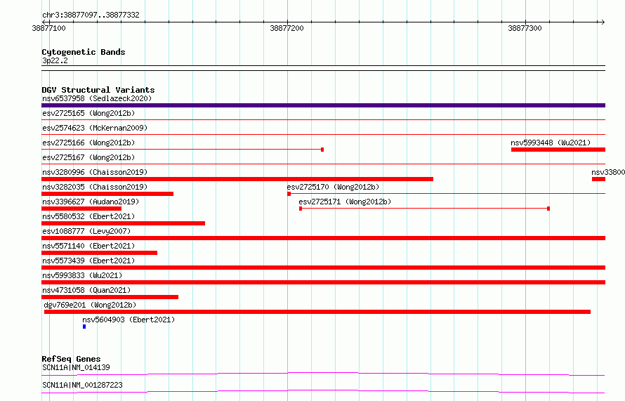 | | Variant Type | CNV deletion | | Copy Number | | | Allele State | | | Allele Origin | | | Probe Count | | | Validation Flag | | | Merged Status | S | | Merged Variants | esv2725165, esv2725167 | | Supporting Variants | | | Samples | SSM011 | | Known Genes | SCN11A | | Method | Sequencing | | Analysis | Breakdancer:4 times standard deviation,VariationHunter:4 times standard deviation and at least 3 supportting reads | | Platform | Illumina HiSeq 2000 | | Comments | | | Reference | Wong_et_al_2012b | | Pubmed ID | 23290073 | | Accession Number(s) | essv6848643