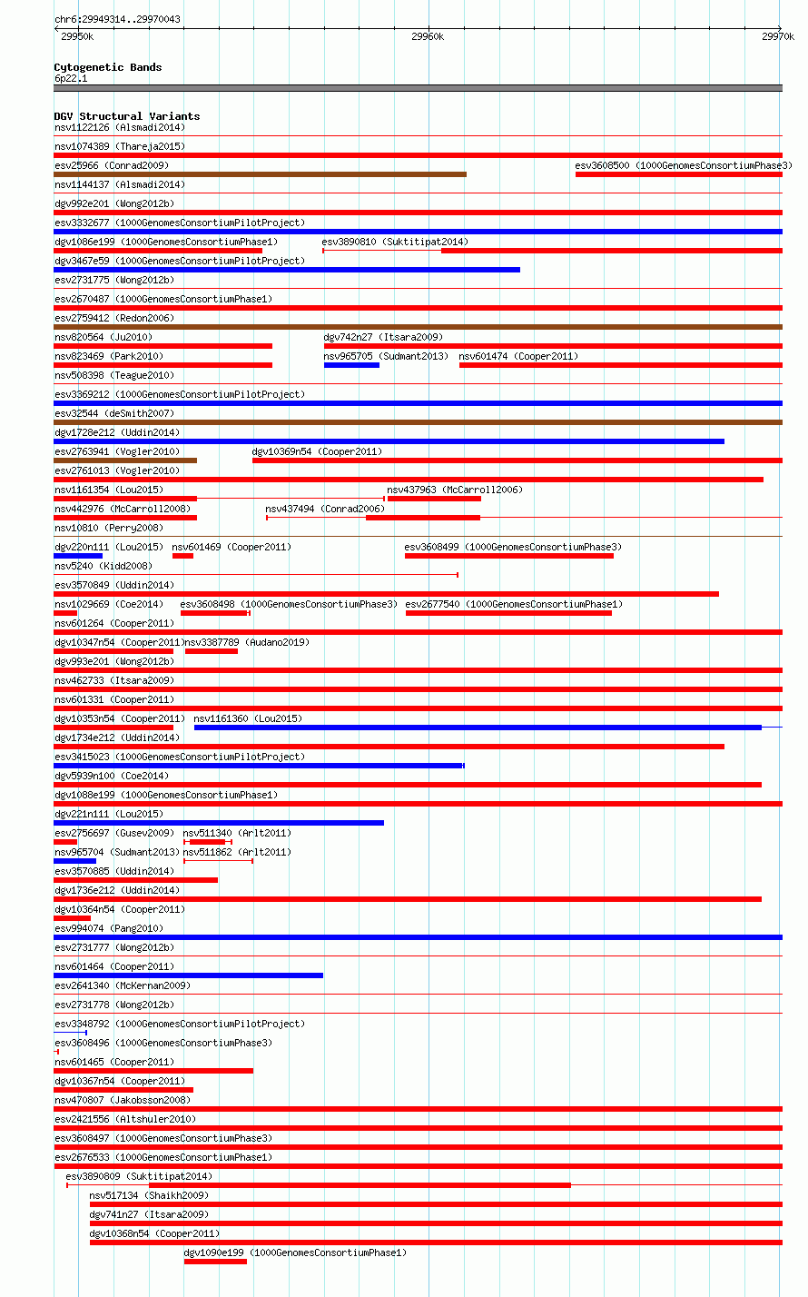 Variant DetailsVariant: essv6849057| Internal ID | 9900946 | | Landmark | | | Location Information | | | Cytoband | 6p22.1 | | Allele length | | Assembly | Allele length | | hg38 | 20730 | | hg19 | 20730 |
