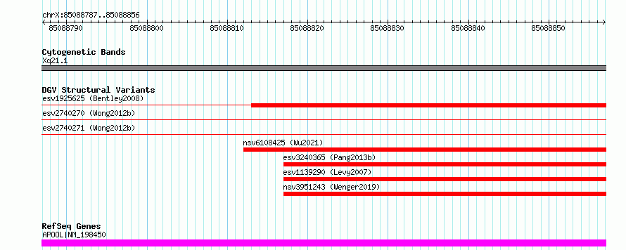 Variant DetailsVariant: essv6849960| Internal ID | 10248445 | | Landmark | | | Location Information | | | Cytoband | Xq21.1 | | Allele length | | Assembly | Allele length | | hg38 | 70 | | hg19 | 70 |