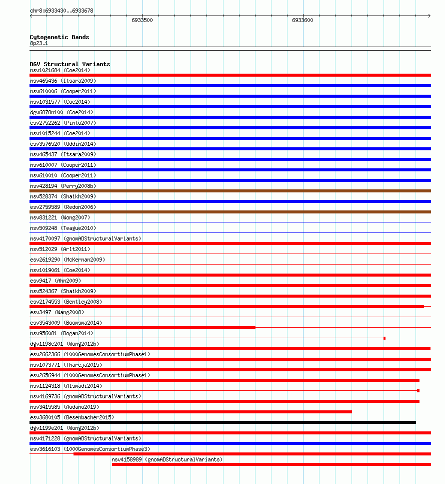 Variant DetailsVariant: essv6850104| Internal ID | 9901889 | | Landmark | | | Location Information | | | Cytoband | 8p23.1 | | Allele length | | Assembly | Allele length | | hg38 | 249 | | hg19 | 249 |
