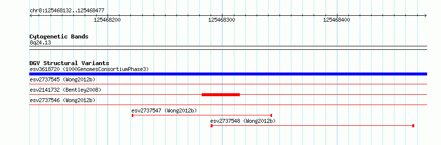 Variant DetailsVariant: essv6850273| Internal ID | 9902041 | | Landmark | | | Location Information | | | Cytoband | 8q24.13 | | Allele length | | Assembly | Allele length | | hg38 | 346 | | hg19 | 346 |