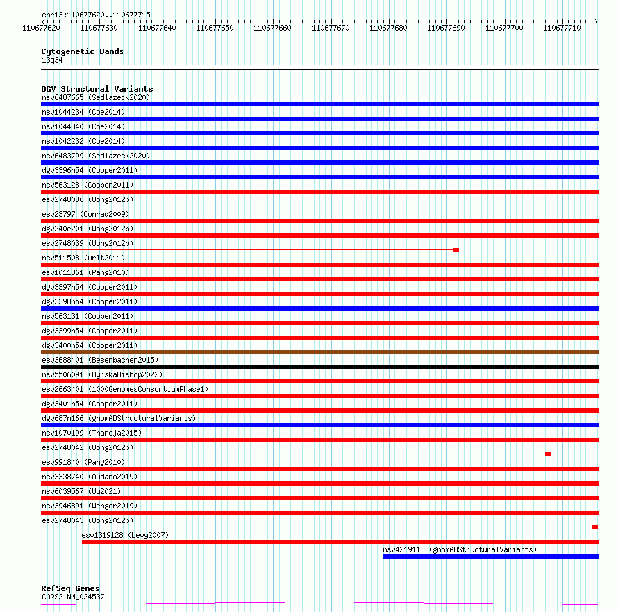 Variant DetailsVariant: essv6851554| Internal ID | 10249880 | | Landmark | | | Location Information | | | Cytoband | 13q34 | | Allele length | | Assembly | Allele length | | hg38 | 96 | | hg19 | 96 |