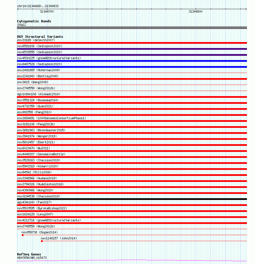 Variant DetailsVariant: essv6851622| Internal ID | 10249941 | | Landmark | | | Location Information | | | Cytoband | 14q12 | | Allele length | | Assembly | Allele length | | hg38 | 154 | | hg19 | 154 |