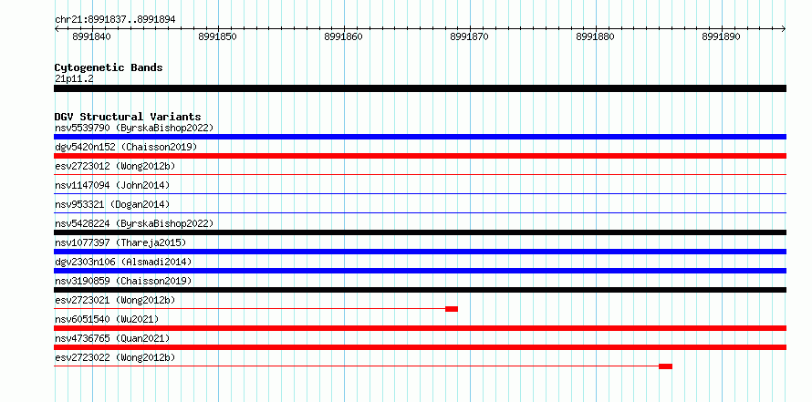 Variant DetailsVariant: essv6853028| Internal ID | 10251208 | | Landmark | | | Location Information | | | Cytoband | 21p11.2 | | Allele length | | Assembly | Allele length | | hg38 | 58 | | hg19 | 58 |