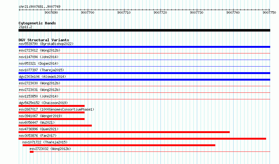 Variant DetailsVariant: essv6853031| Internal ID | 10251210 | | Landmark | | | Location Information | | | Cytoband | 21p11.2 | | Allele length | | Assembly | Allele length | | hg38 | 69 | | hg19 | 69 |
