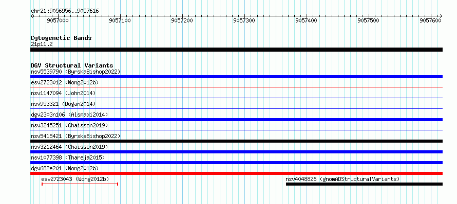 Variant DetailsVariant: essv6853035| Internal ID | 10251214 | | Landmark | | | Location Information | | | Cytoband | 21p11.2 | | Allele length | | Assembly | Allele length | | hg38 | 661 | | hg19 | 661 |