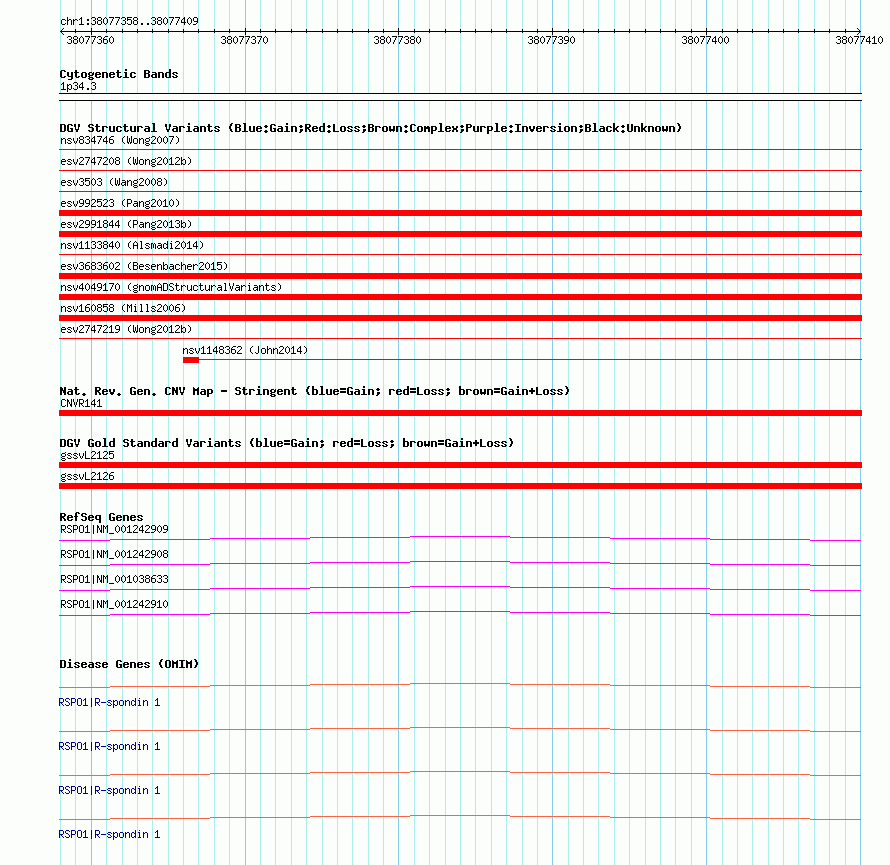 Variant DetailsVariant: essv6853273| Internal ID | 9904742 | | Landmark | | | Location Information | | | Cytoband | 1p34.3 | | Allele length | | Assembly | Allele length | | hg19 | 52 |