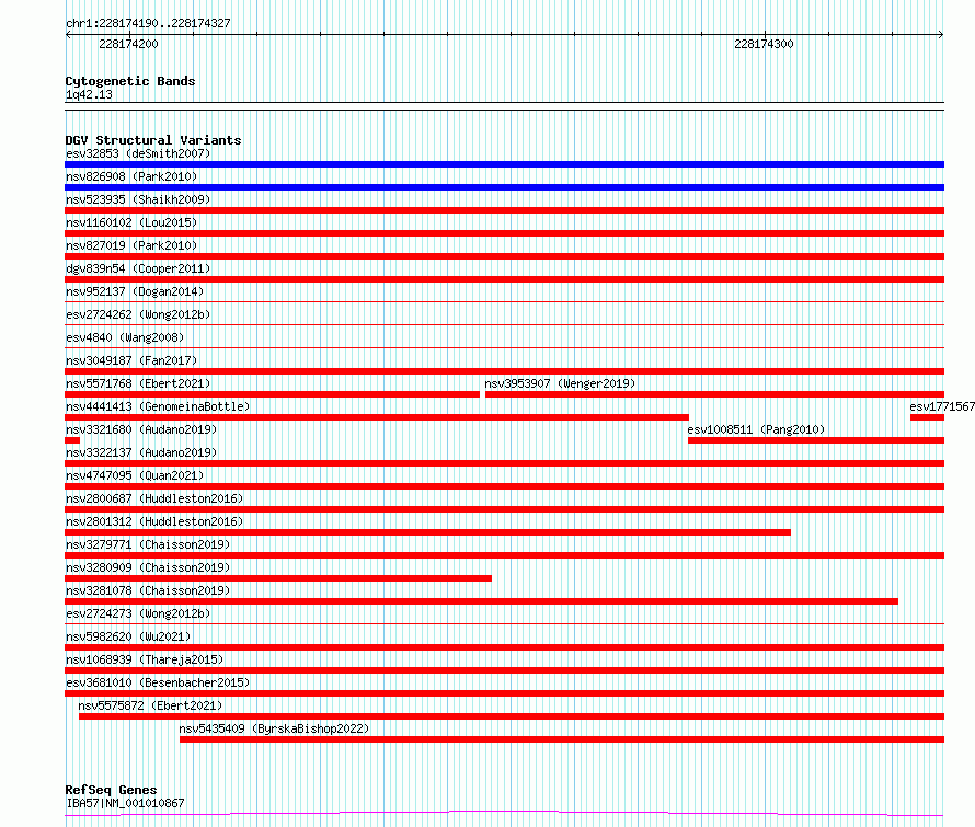 Variant DetailsVariant: essv6853506| Internal ID | 10251638 | | Landmark | | | Location Information | | | Cytoband | 1q42.13 | | Allele length | | Assembly | Allele length | | hg38 | 138 | | hg19 | 138 |