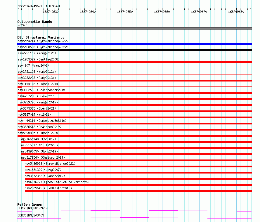 Variant DetailsVariant: essv6853871| Internal ID | 10251968 | | Landmark | | | Location Information | | | Cytoband | 2q24.3 | | Allele length | | Assembly | Allele length | | hg38 | 63 | | hg19 | 63 |