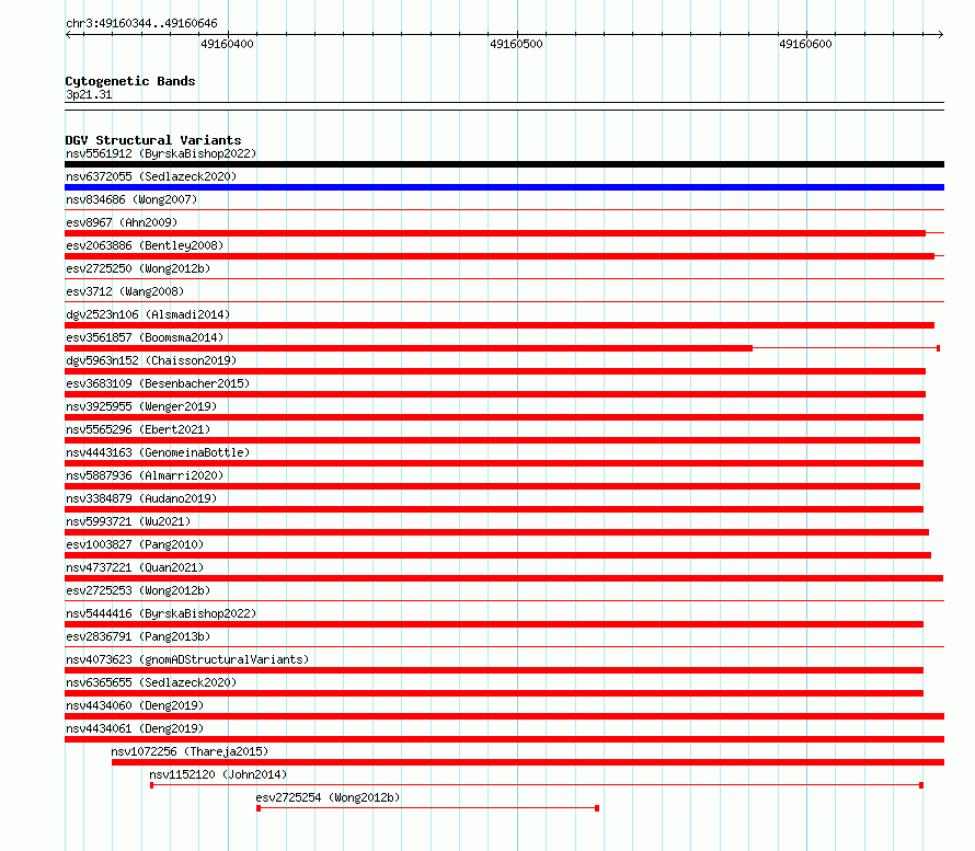 Variant DetailsVariant: essv6854082| Internal ID | 10252158 | | Landmark | | | Location Information | | | Cytoband | 3p21.31 | | Allele length | | Assembly | Allele length | | hg38 | 303 | | hg19 | 303 |