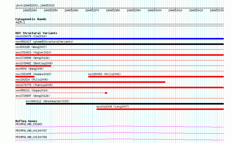 | | Variant Type | CNV deletion | | Copy Number | | | Allele State | | | Allele Origin | | | Probe Count | | | Validation Flag | | | Merged Status | S | | Merged Variants | esv2728896, esv2728897 | | Supporting Variants | | | Samples | SSM087 | | Known Genes | PRIMPOL | | Method | Sequencing | | Analysis | Breakdancer:4 times standard deviation,VariationHunter:4 times standard deviation and at least 3 supportting reads | | Platform | Illumina HiSeq 2000 | | Comments | | | Reference | Wong_et_al_2012b | | Pubmed ID | 23290073 | | Accession Number(s) | essv6854684