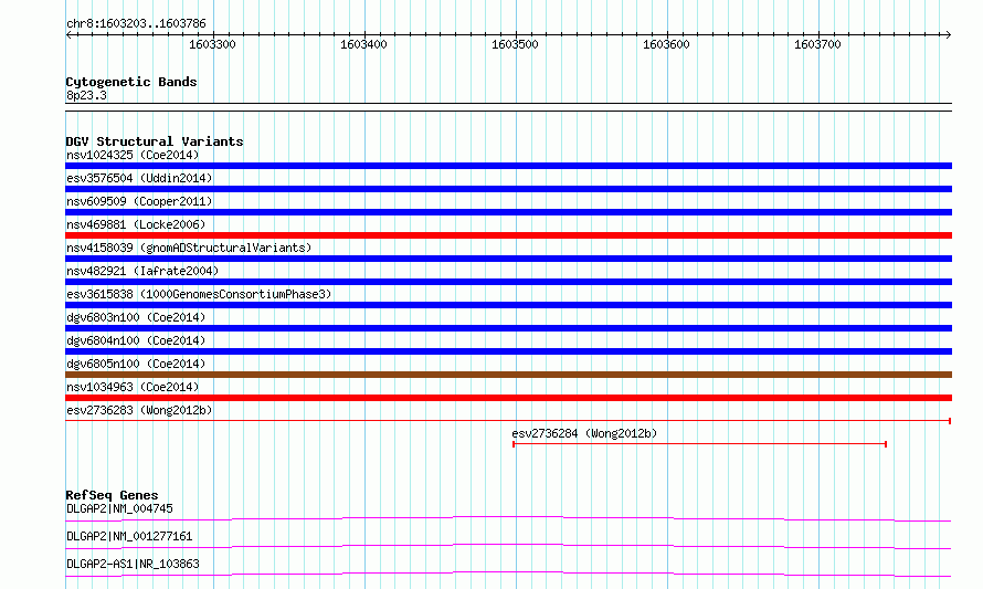 | Variant Type | CNV deletion | Copy Number | | Allele State | | Allele Origin | | Probe Count | | Validation Flag | | Merged Status | S | Merged Variants | esv2736283 | Supporting Variants | | Samples | SSM087 | Known Genes | DLGAP2, LOC100507435 | Method | Sequencing | Analysis | Breakdancer:4 times standard deviation,VariationHunter:4 times standard deviation and at least 3 supportting reads | Platform | Illumina HiSeq 2000 | Comments | | Reference | Wong_et_al_2012b | Pubmed ID | 23290073 | Accession Number(s) | essv6856093