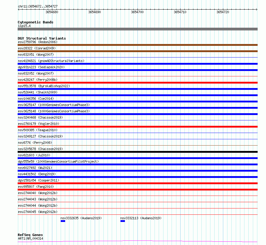 Variant DetailsVariant: essv6856914| Internal ID | 10254706 | | Landmark | | | Location Information | | | Cytoband | 11p15.4 | | Allele length | | Assembly | Allele length | | hg38 | 56 | | hg19 | 56 |