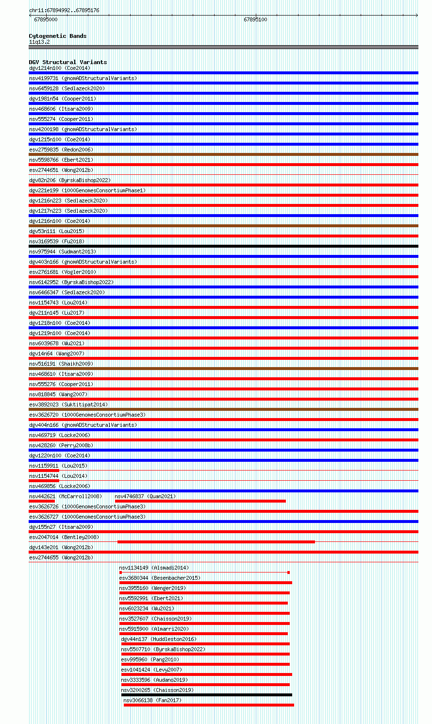 Variant DetailsVariant: essv6857028| Internal ID | 10254809 | | Landmark | | | Location Information | | | Cytoband | 11q13.2 | | Allele length | | Assembly | Allele length | | hg38 | 185 | | hg19 | 185 |