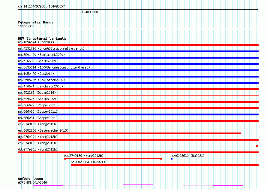 Variant DetailsVariant: essv6857726| Internal ID | 10255437 | | Landmark | | | Location Information | | | Cytoband | 14q32.33 | | Allele length | | Assembly | Allele length | | hg38 | 140 | | hg19 | 140 |