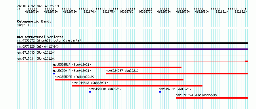 Variant DetailsVariant: essv6858418| Internal ID | 10256061 | | Landmark | | | Location Information | | | Cytoband | 18q21.1 | | Allele length | | Assembly | Allele length | | hg38 | 122 | | hg19 | 122 |