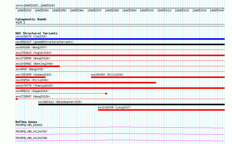 Variant DetailsVariant: essv6860386| Internal ID | 9913155 | | Landmark | | | Location Information | | | Cytoband | 4q35.1 | | Allele length | | Assembly | Allele length | | hg38 | 119 | | hg19 | 119 |
