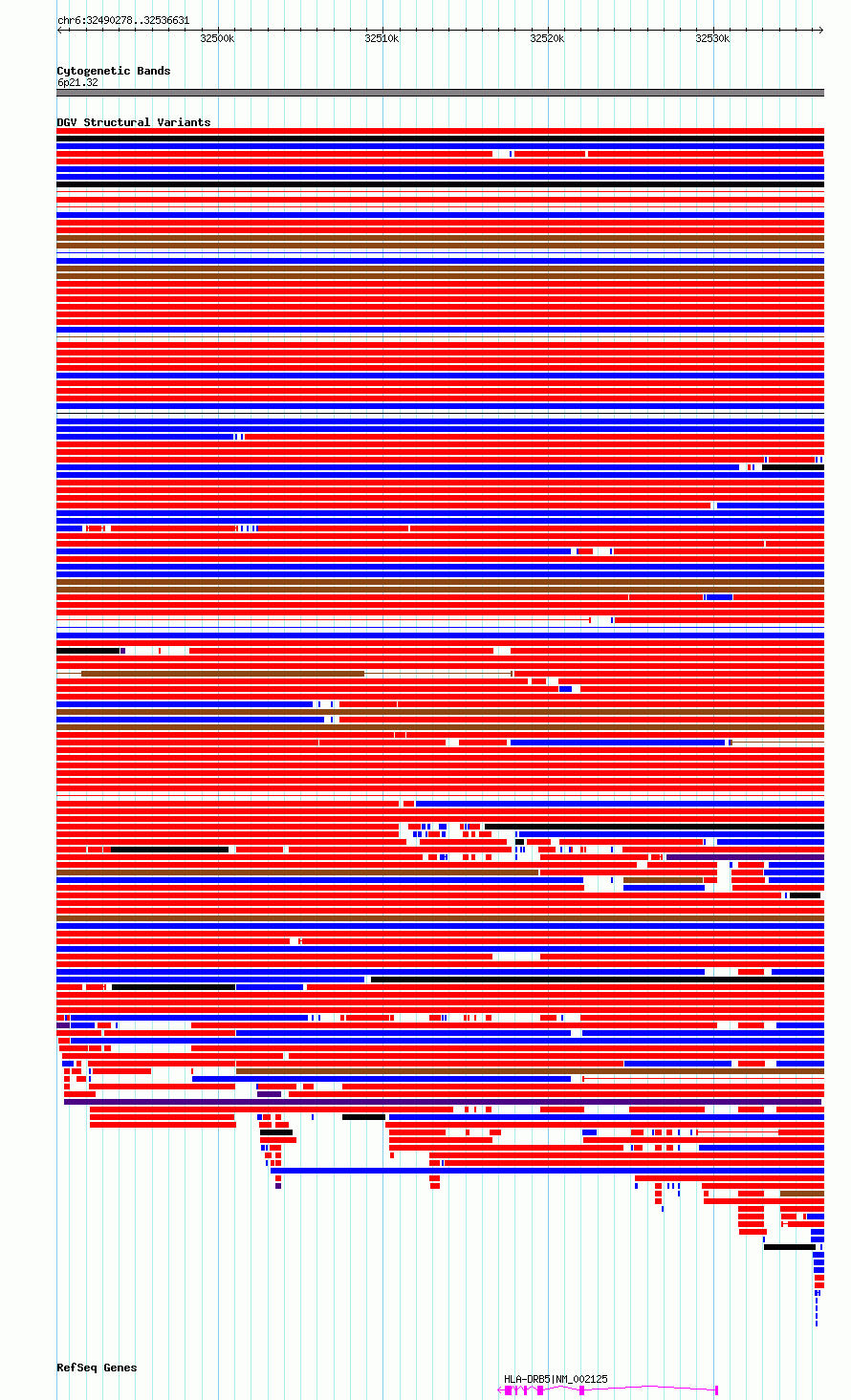 Variant DetailsVariant: essv6860809| Internal ID | 10259460 | | Landmark | | | Location Information | | | Cytoband | 6p21.32 | | Allele length | | Assembly | Allele length | | hg38 | 46354 | | hg19 | 46354 |
