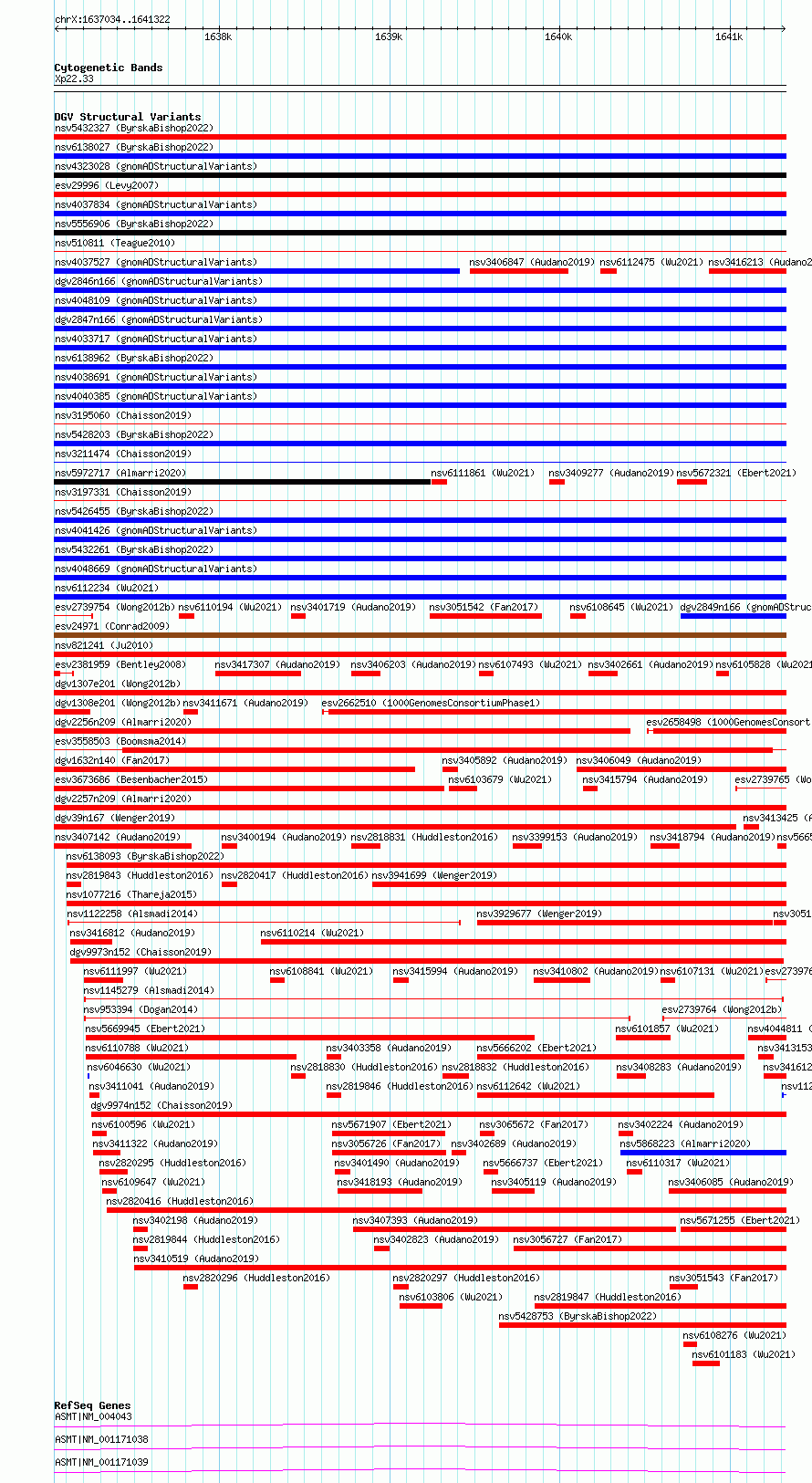 Variant DetailsVariant: essv6861425| Internal ID | 10258906 | | Landmark | | | Location Information | | | Cytoband | Xp22.33 | | Allele length | | Assembly | Allele length | | hg38 | 4289 | | hg19 | 4289 |