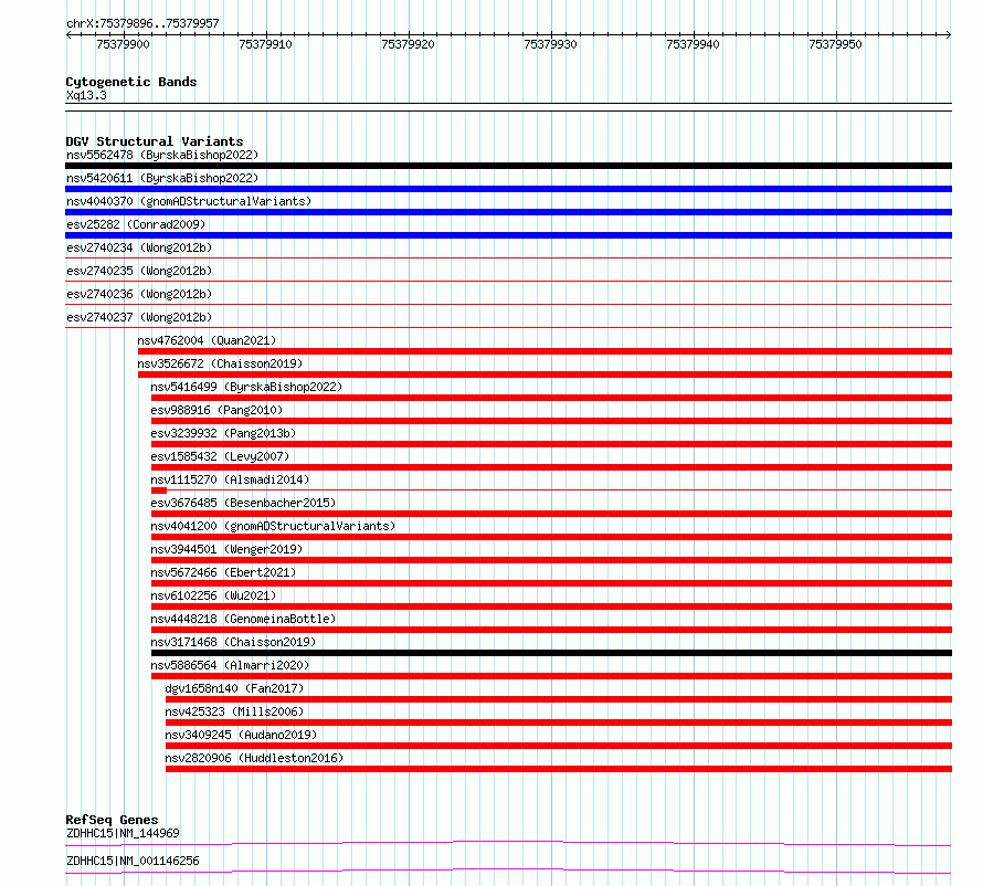 Variant DetailsVariant: essv6861474| Internal ID | 10258861 | | Landmark | | | Location Information | | | Cytoband | Xq13.3 | | Allele length | | Assembly | Allele length | | hg38 | 62 | | hg19 | 62 |