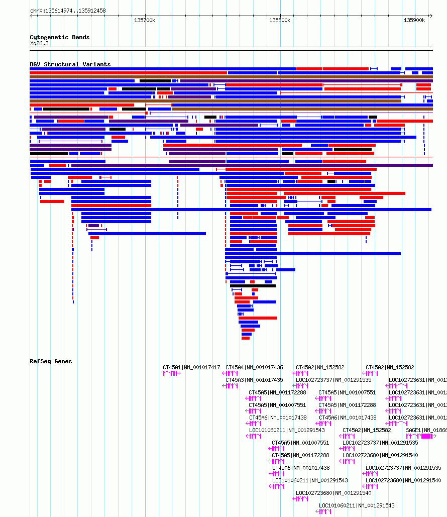 | | Variant Type | CNV deletion | | Copy Number | | | Allele State | | | Allele Origin | | | Probe Count | | | Validation Flag | | | Merged Status | S | | Merged Variants | esv2740498 | | Supporting Variants | | | Samples | SSM088 | | Known Genes | CT45A1, CT45A2, CT45A3, CT45A4, CT45A5, CT45A6, SAGE1 | | Method | Sequencing | | Analysis | Breakdancer:4 times standard deviation,VariationHunter:4 times standard deviation and at least 3 supportting reads | | Platform | Illumina HiSeq 2000 | | Comments | | | Reference | Wong_et_al_2012b | | Pubmed ID | 23290073 | | Accession Number(s) | essv6861500