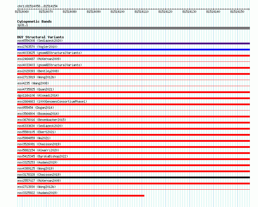 Variant DetailsVariant: essv6864029| Internal ID | 10261110 | | Landmark | | | Location Information | | | Cytoband | 1p31.1 | | Allele length | | Assembly | Allele length | | hg38 | 97 | | hg19 | 97 |